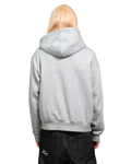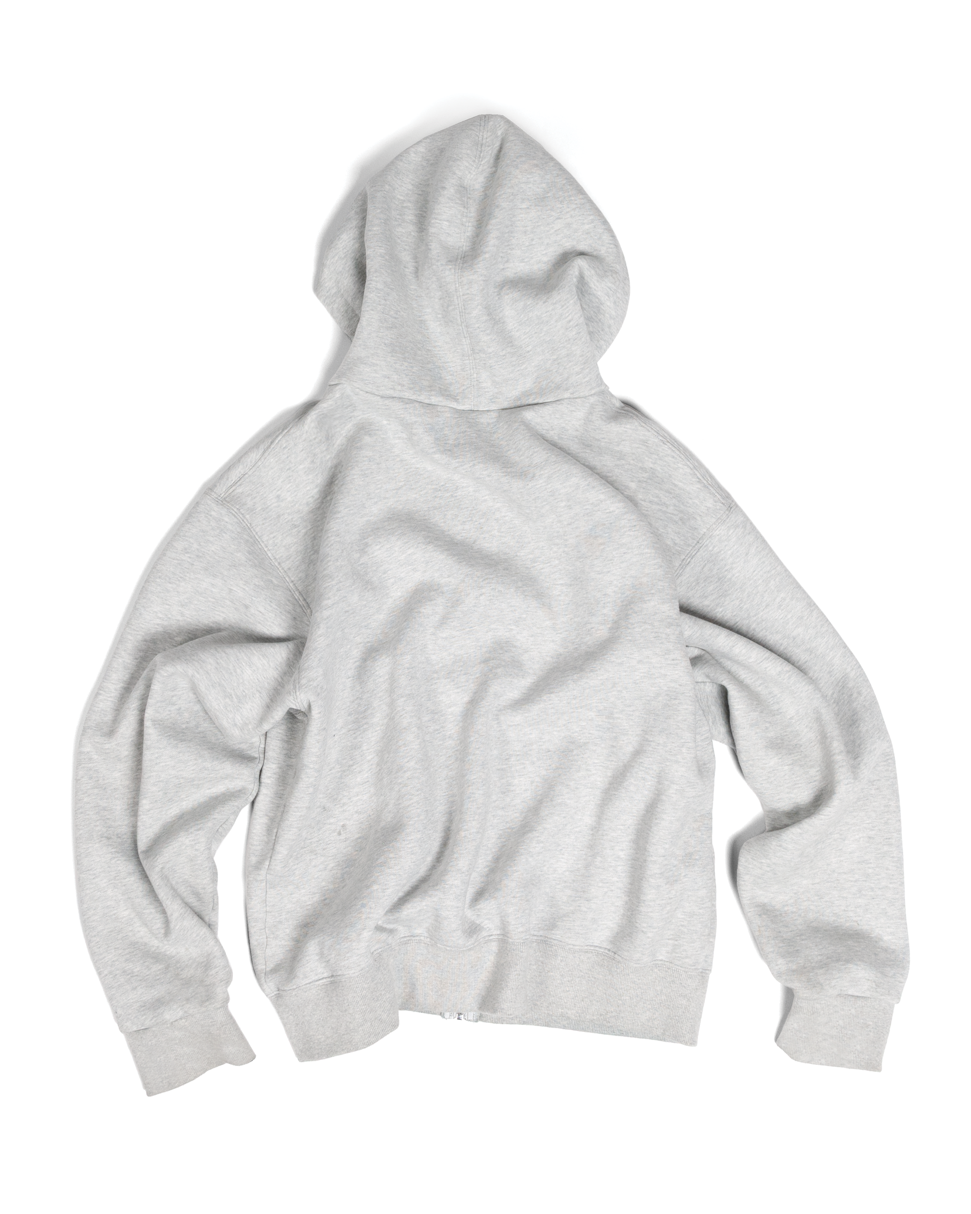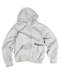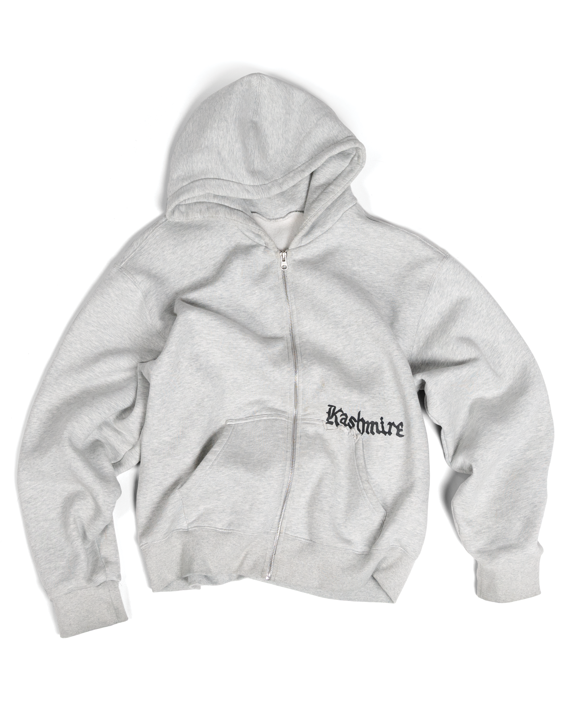 Heather Grey zipup hoodie with a distress on the front pocket & a black screen print under it