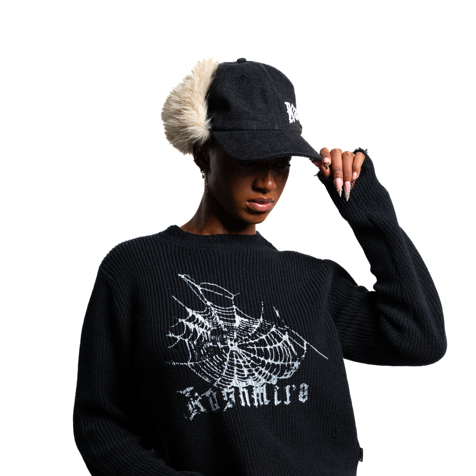 Black Denim cap with beige fur ears
