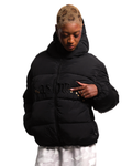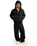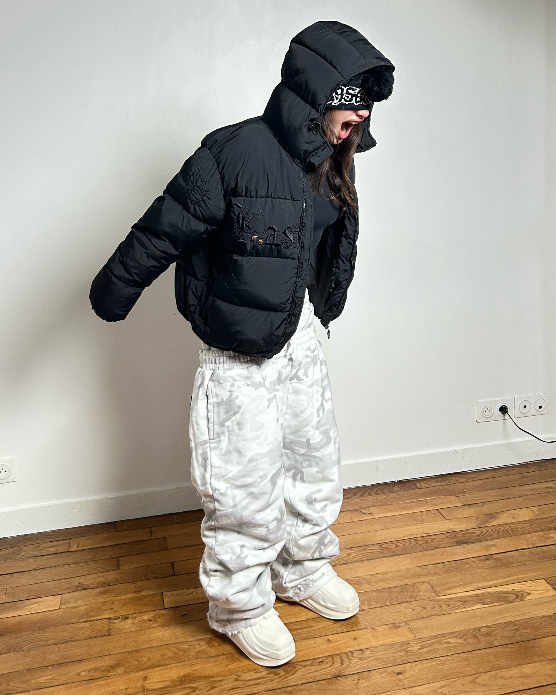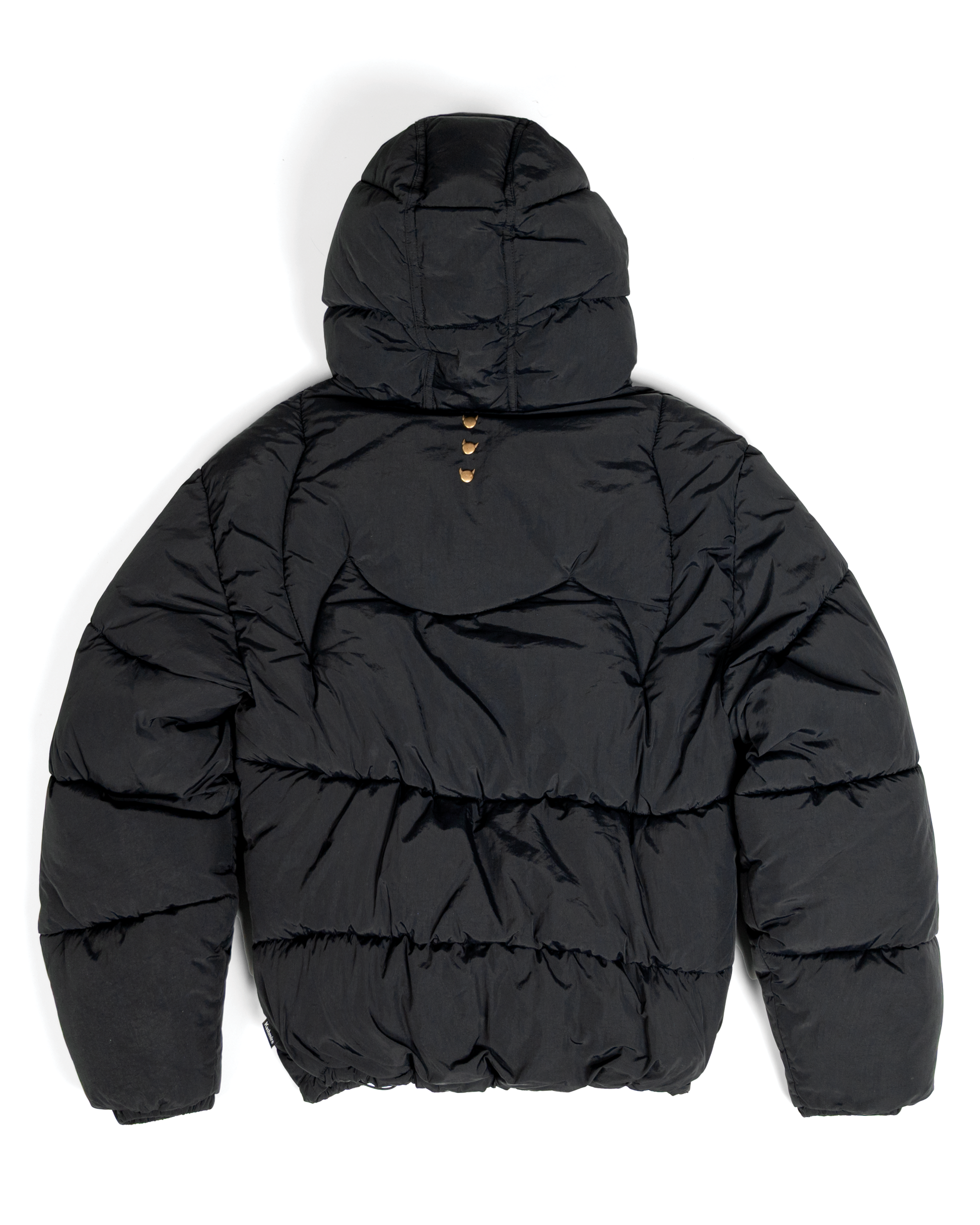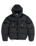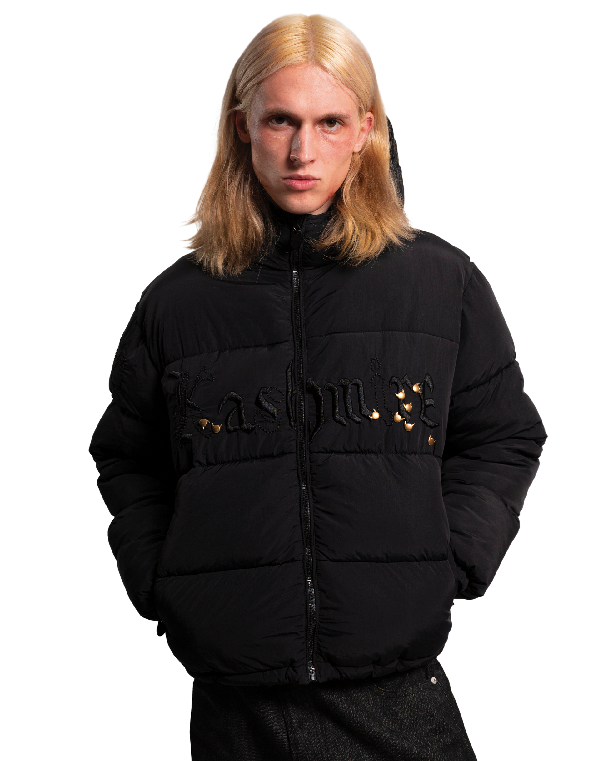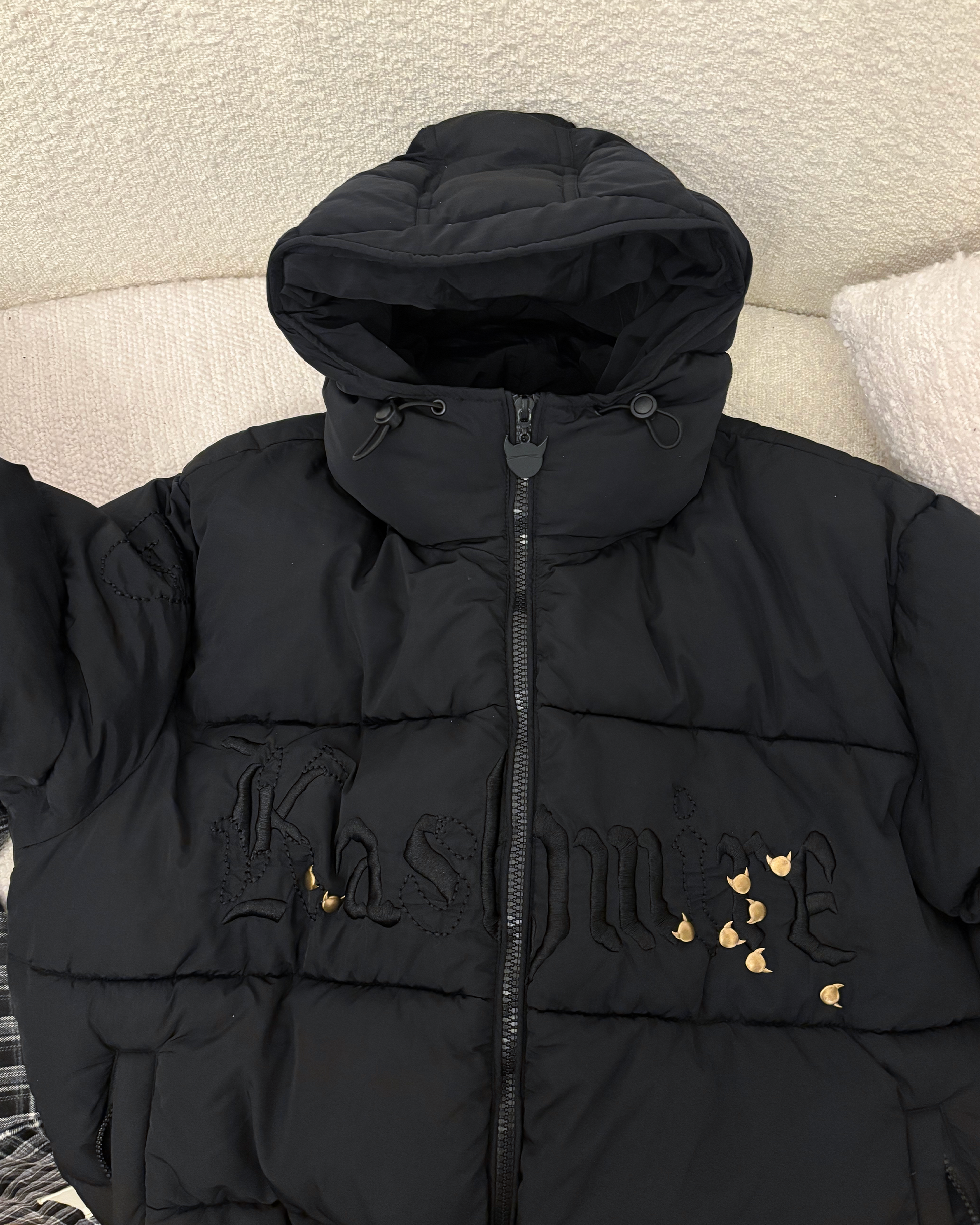 Black puffer jacket with black embroidery on the chest & 9 rivets color "ancient gold" over it